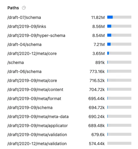The top result, at 11.82 million, is /draft-07/schema. This suggests that draft-07 JSON Schema is the most popular passed to misbehaving implementations. (Most well behaved implementations won't go download the meta-schemas, because they already have it! This includes the most popular implementations!)